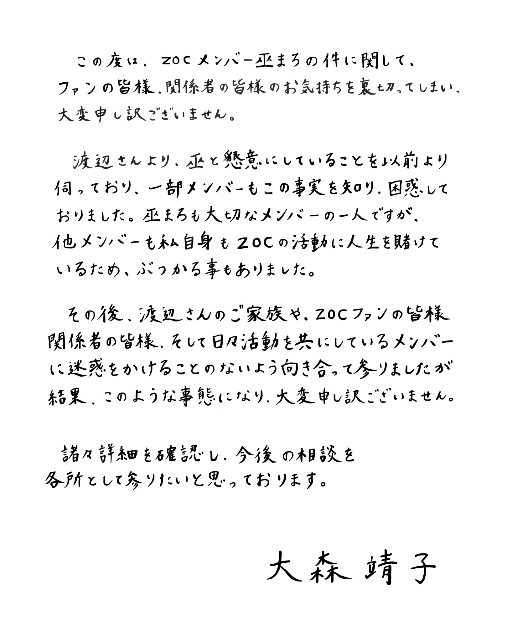 渡辺氏は「報道につきまして」として「ZOCファンの皆様やWACKをご支援いただいている関係者の皆様の思いを裏切るようなことをしてしまい、大変申し訳ありません」と謝罪。