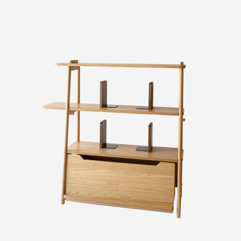 ベッドルームに置かれている、左右非対称のデザインの棚は、こちらのものでした!