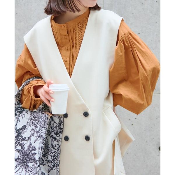 白いトップスは、セルフォード ダイヤスリットペプラムカーディガン